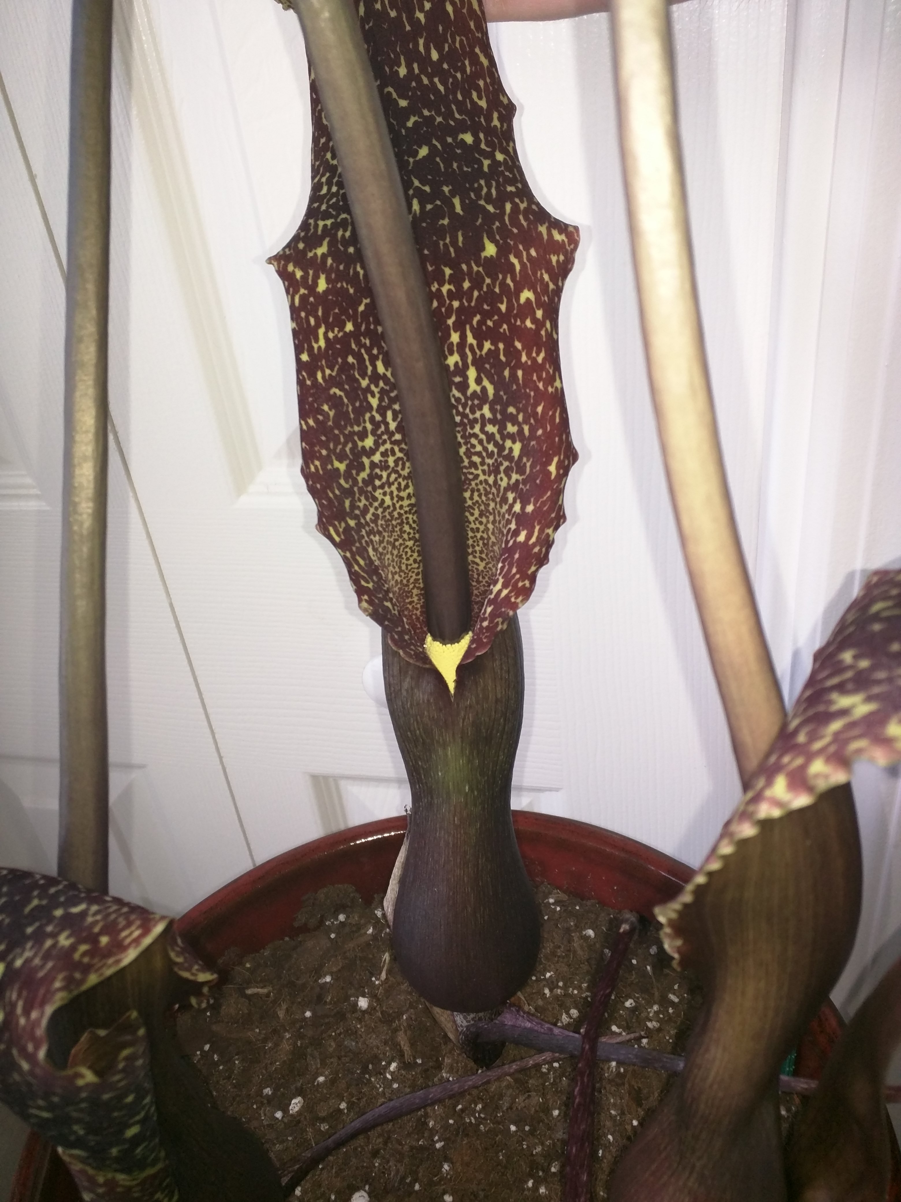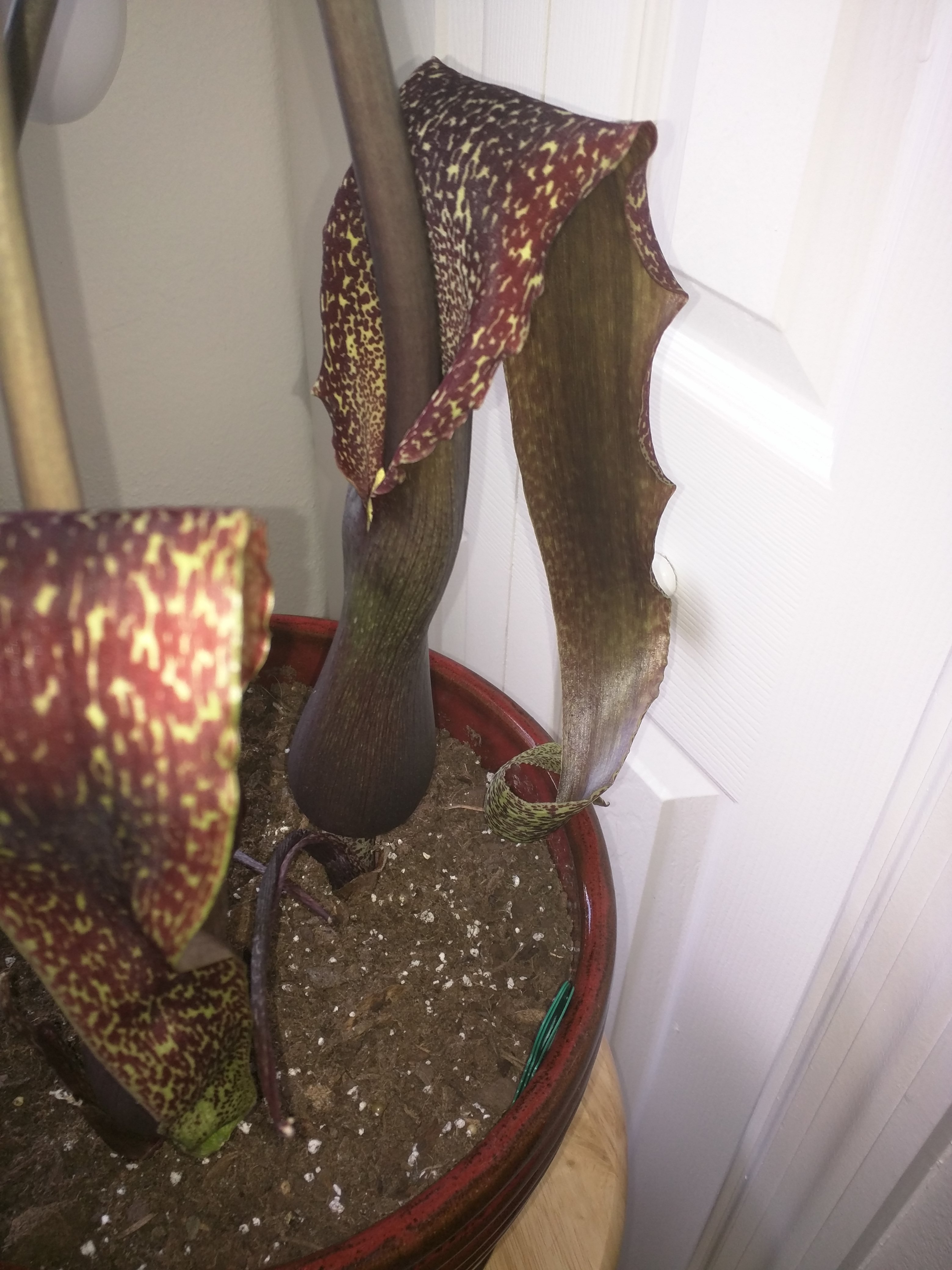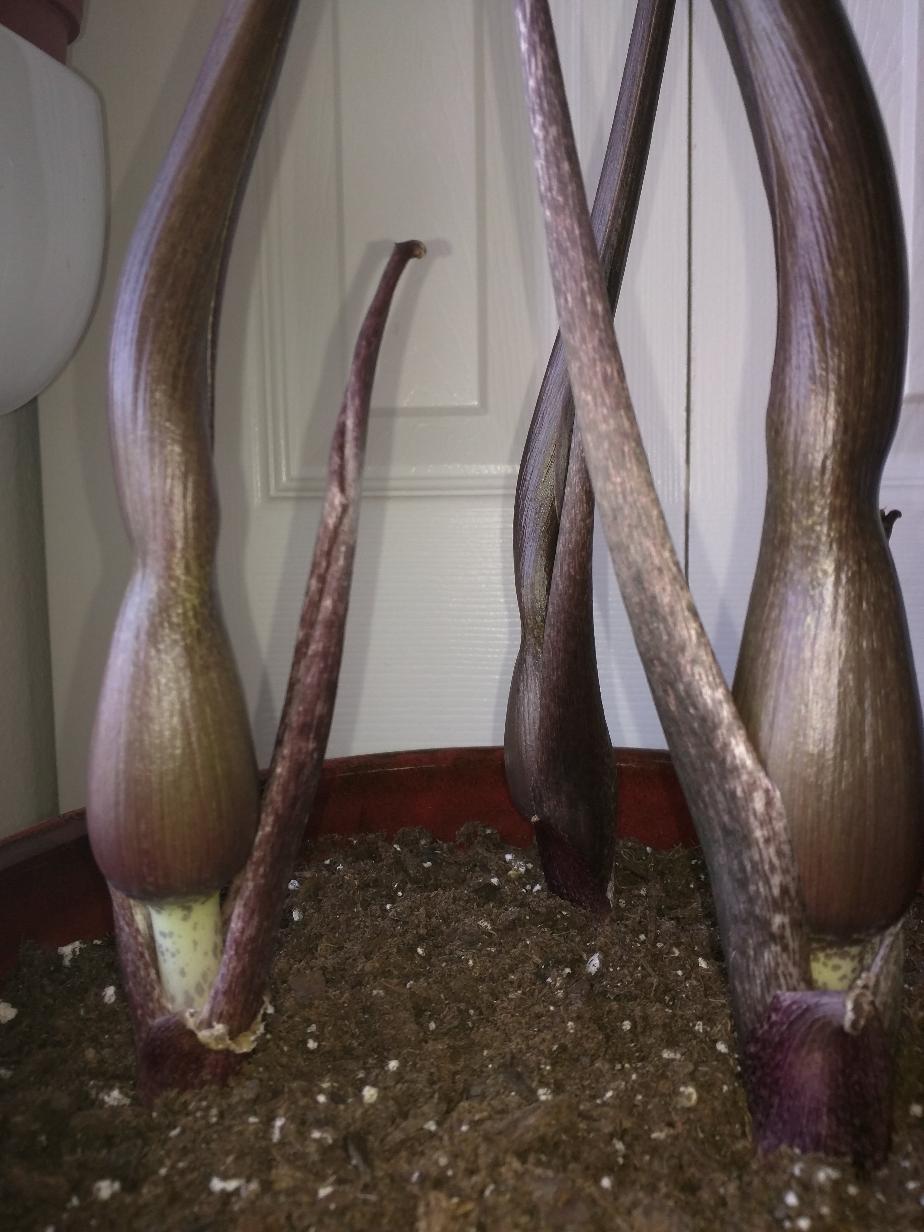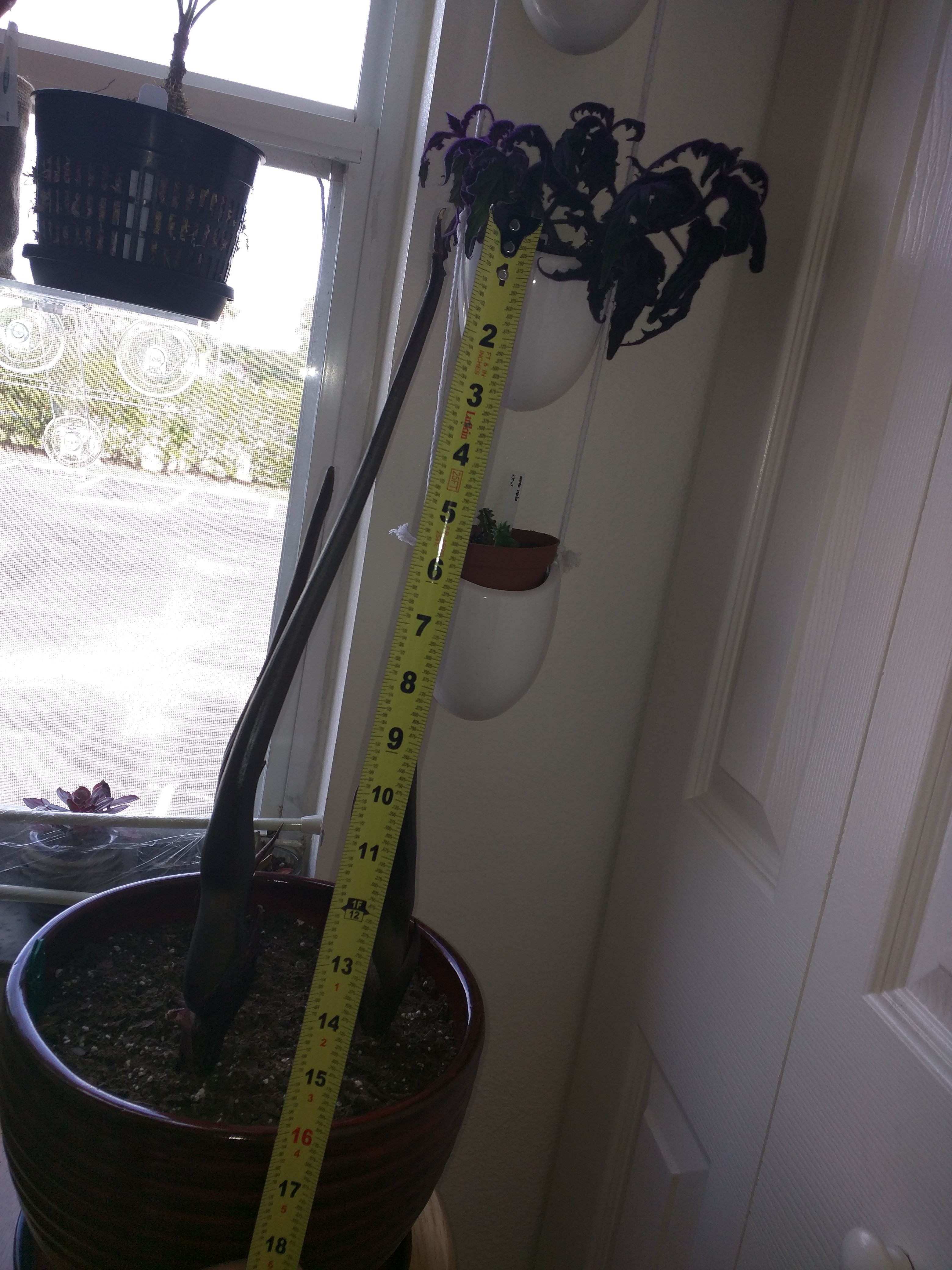 The flowers finally unfurled on May 24th. After 20 days of growth, the tallest was 25 inches so it averaged 1.25" in growth per day. They are gorgeous, macabre, and alien. The smell is like being trapped in a hot, under-maintained barn crowded with ungulates. Fortunately, it should only last about two days.