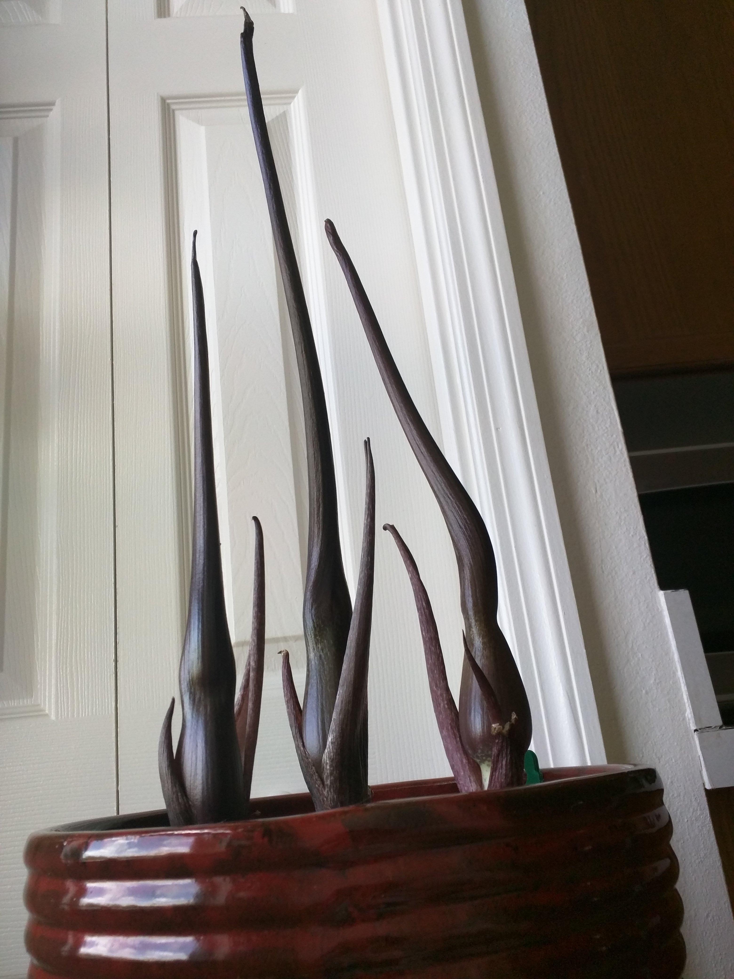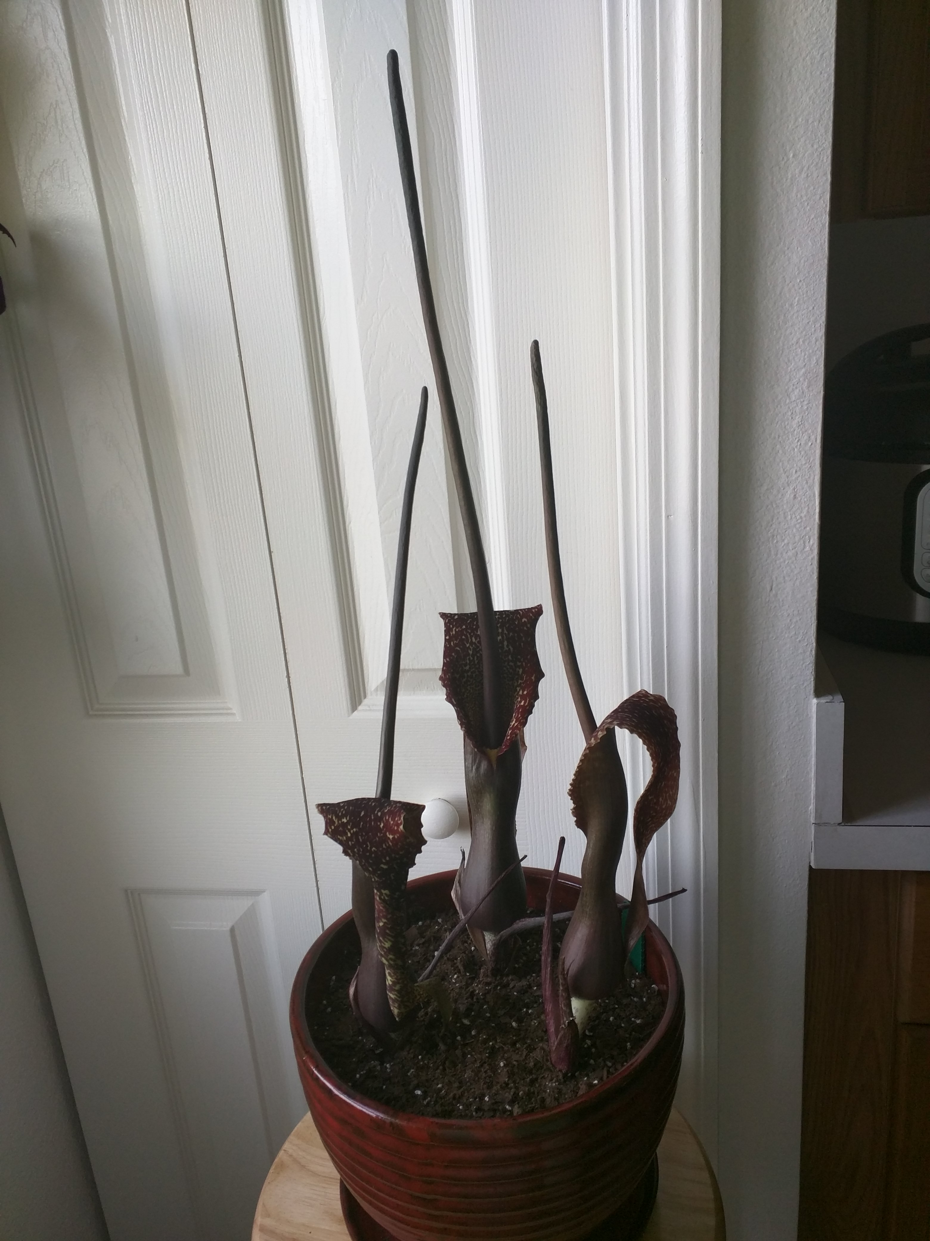 The flowers finally unfurled on May 24th. After 20 days of growth, the tallest was 25 inches so it averaged 1.25" in growth per day. They are gorgeous, macabre, and alien. The smell is like being trapped in a hot, under-maintained barn crowded with ungulates. Fortunately, it should only last about two days.